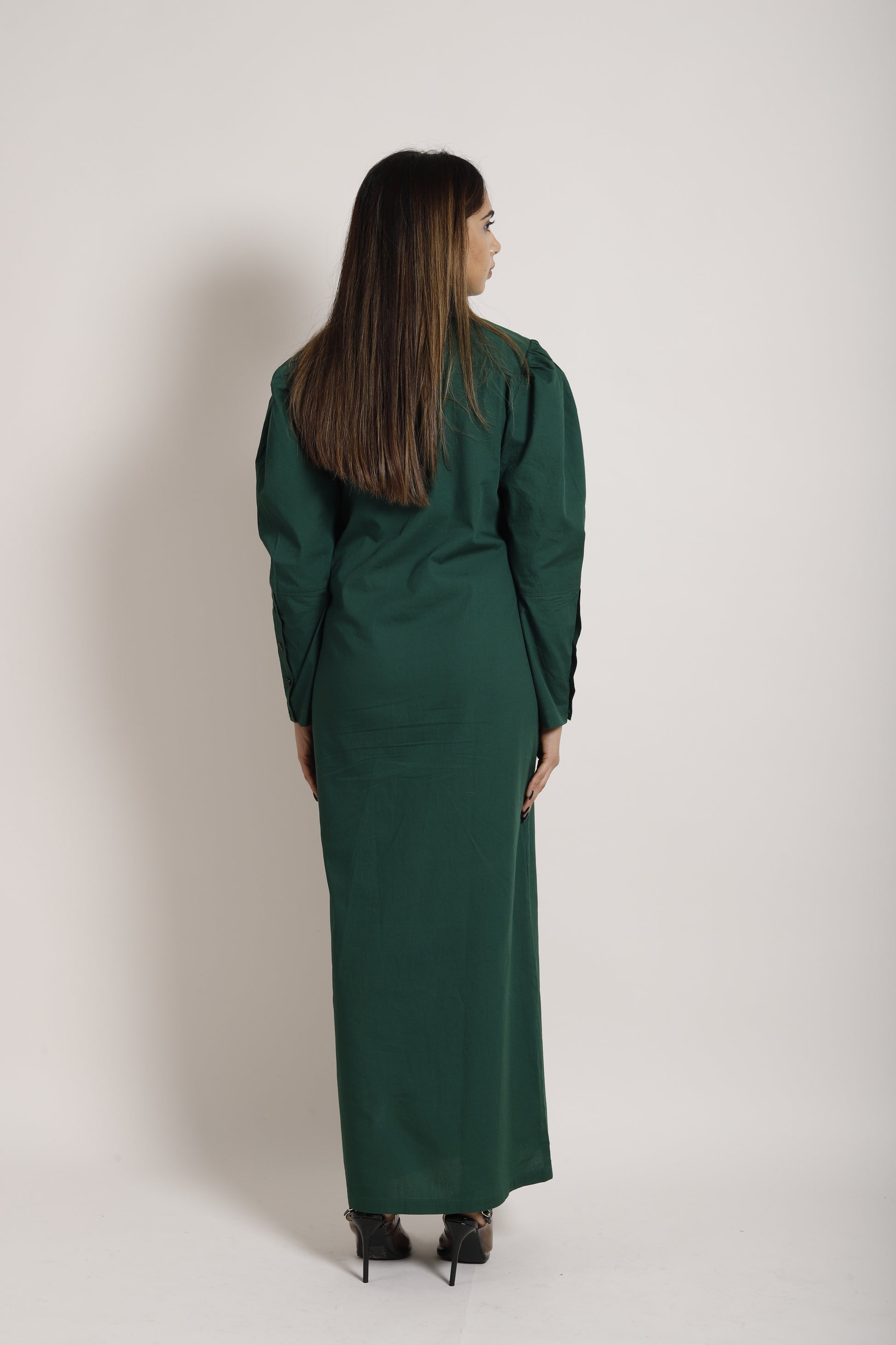 Svelte with an asymmetrical button-down silhouette that can be elegant yet fun, it is completed with statement sleeves and button detail at the cuff, highlighting her versatility for every occasion and elevating the luxe cotton fabric.